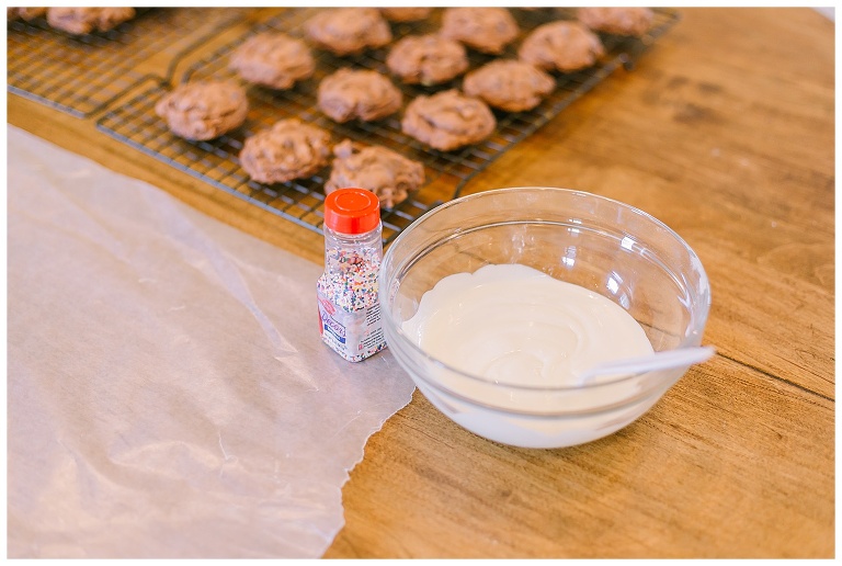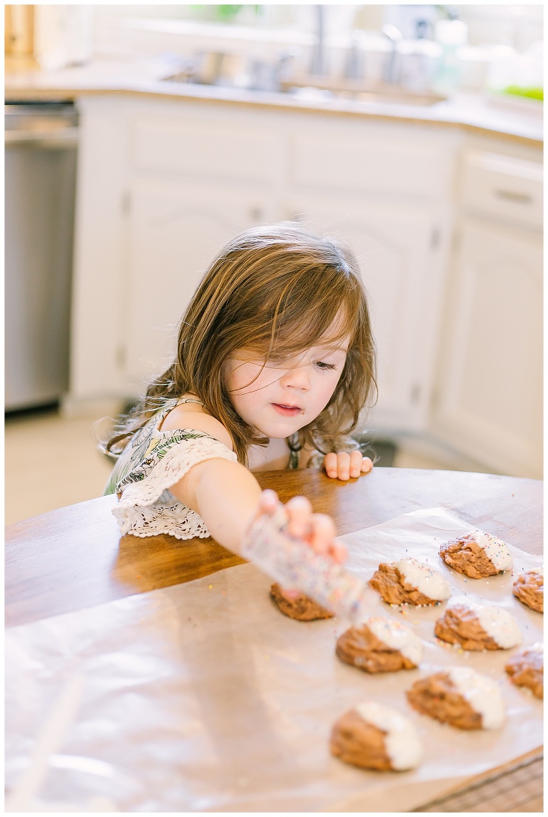- Make sure cookies have completely cooled and dip them halfway into the melted vanilla bark, lay them on wax paper and sprinkle. This is where my kiddos come in handy!